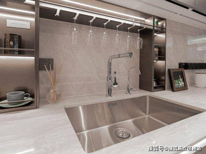 进门左手边,雪山银湖透光奢石作为置物台面,质感非凡。
