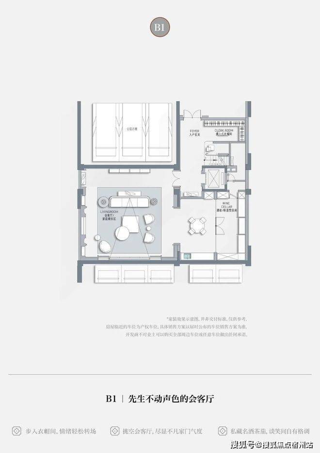 • 从容抵达步入地下会客厅,转角衣帽间换一身便服,轻松切换身份情绪