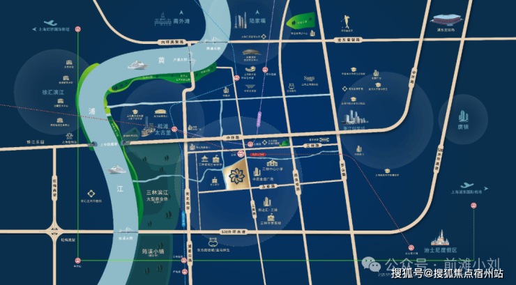 交通硬核 :距 11 号线三林站 直线约 350 米,步行 5 分钟即达, 1 站到前滩、2 站到徐汇滨江、5 站到徐家汇 ,换乘 6/8 号线可直达陆家嘴、人民广场 [12]。自驾 3 分钟上外环、5 分钟上中环,杨高南路、上南路等干道环绕,20 分钟通达陆家嘴、张江、前滩等核心商圈。