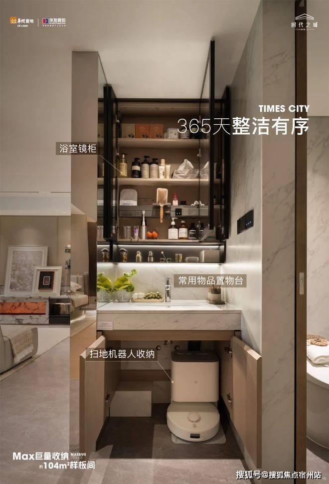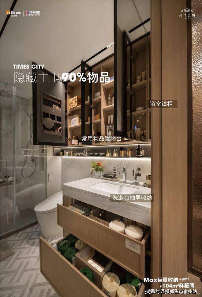 主卫更是做了通长镜柜和置物台,两大镜柜+一个美妆冰箱,✅✅时代之城售楼处电话:400 - 882 - 4258✅✅内置牙刷清洁器、插座、化妆工具插槽等分区。