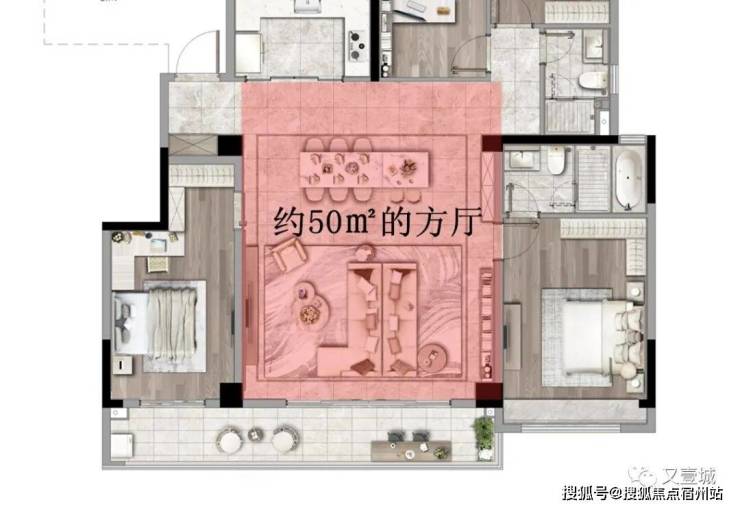 近50㎡的方厅,本不应该出现在这个面积段的住宅里, 它的安放地,应该在250㎡+的大平层空间。