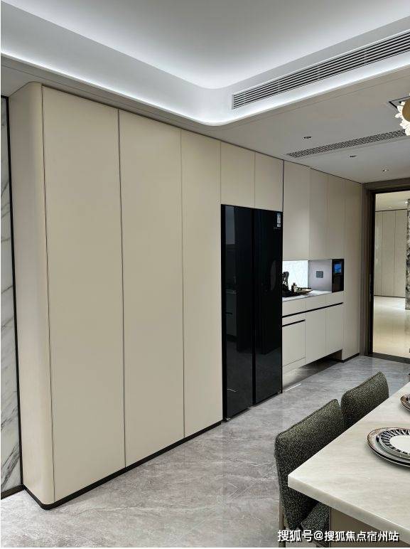 通过示意图我们会看到,一般项目的玄关柜处于成本原因只会做到下图中间位置的冰箱位置就结束,而外滩源著在标配的双开门冰箱(小户型博世或同等品牌、大户型利勃海尔或同等品牌)左侧还额外交付有完整的储物空间:进到实地约99平样板房,整个玄关柜几乎全部都是皮质缝线包裹,细节拉满;打开柜门,内外都是皮革包裹,质感进一步提升:进到主卧,L形衣柜同样是交付标准,抽屉部分和半开放水吧台位置全部都是交付标准;在全上海99%的同价位样板房里,卧室衣柜都是非交付的。在今年上半年大家都在卷人字拼地板的基础上,外滩源著主卧地板升级为柳叶拼接,进一步做了升级:看到约143平户型,厨房岛台和上柜都不稀奇,厨房外的半开放式餐边柜和利勃海尔内嵌式同样也作为交付标准附赠,柜体额外提供接近1立方面积的收纳空间:在约143平户型中,入户玄关收纳区被分为2个部分——一个是进门正对的区域,一个是进门后的步入式区域,两侧都标配有充裕的收纳空间。和约99平户型不同,约143平户型在玄关柜末端还设置有半开放水吧台,丰富生活场景:主卧和约99平户型一样,衣柜更大形成衣帽空间,还交付有半开放式、类似于酒店的迷你吧设计:现场样板房照片长这样:收纳空间全部都是来自博洛尼专属定制(或同等品牌),真正做到拎包入住、省去后期定制比价的烦恼;而在收纳空间之外,外滩源著在用料上同样可以称得上卷王——项目厨房台面是全进口的西班牙DEKTON品牌:厨房为美诺三件套交付,这和之前浦江之星保持一致;冰箱小户型为博世、大户型为利勃海尔,都是双开门设计;基础硬件都不差,项目在审美上还做了不少创新——卫生间大量采用奢石和石材,比如主卫柜体墙面就是香格里拉翡翠拼花,龙头是冷热分离式,成本更高:次卫则是采用不同风格,墙面统一采用米洞岩板、地面为深咖色瓷砖,黑金配色风格区别于看多了的海派设计,眼前一亮:卫生间下柜同样是皮革包裹交付,标配智能马桶盖板:入户玄关处的开放格背板采用罕见的白冰玉石材利用人造光源,通过石材的反射和折射,纹理清晰分明;