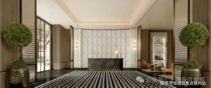 社区主入口更是兼具豪华酒店与海派元素设计风格, 挑高约6米的入户大堂、水系景观与艺术家共创作品 交相辉映,奢华感和高级感拉满!