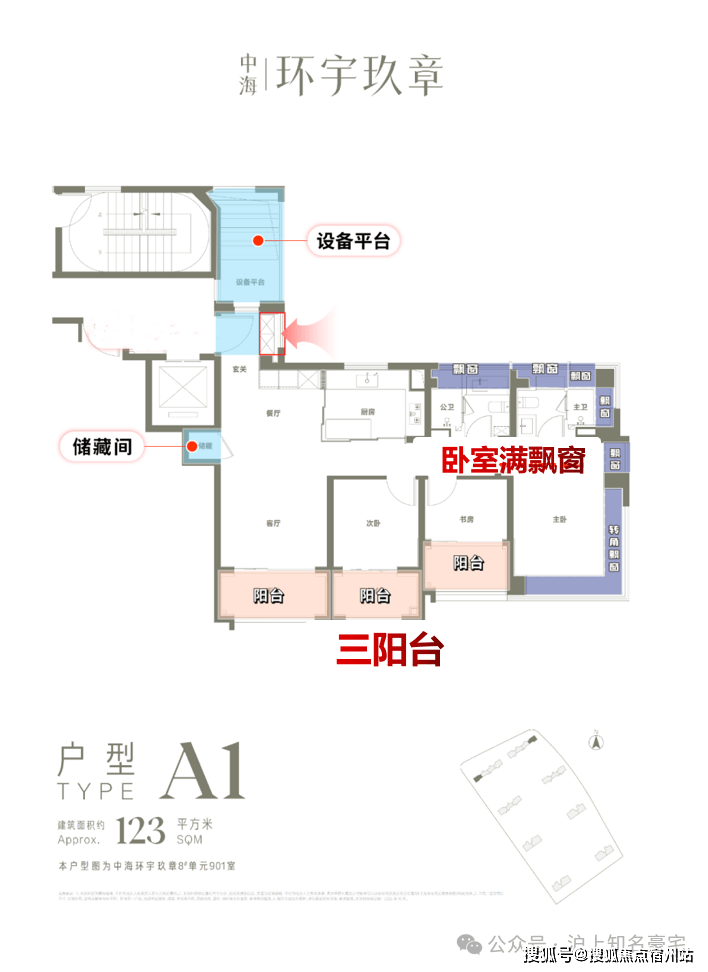 以建面约123㎡户型为例,通过 南向三阳台+全赠送飘窗 , 多享面积接近一间主卧, 实际尺度堪比140㎡!