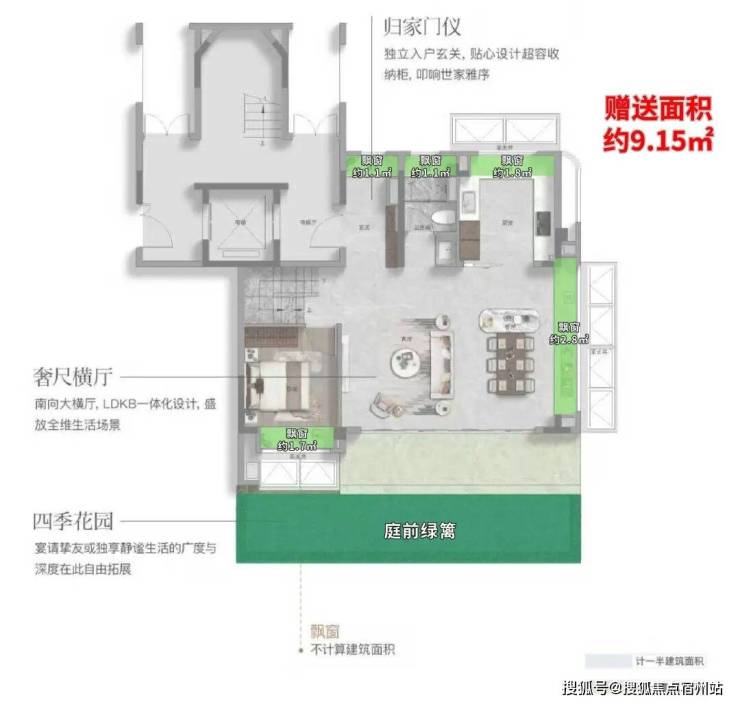在细节打磨上,此户型亦不遗余力。 全屋飘窗全赠送约9.8㎡,配合约7.2㎡的大阳台(计一半建筑面积) 不仅增加了实际使用面积,更在视觉上提升了空间的通透感。