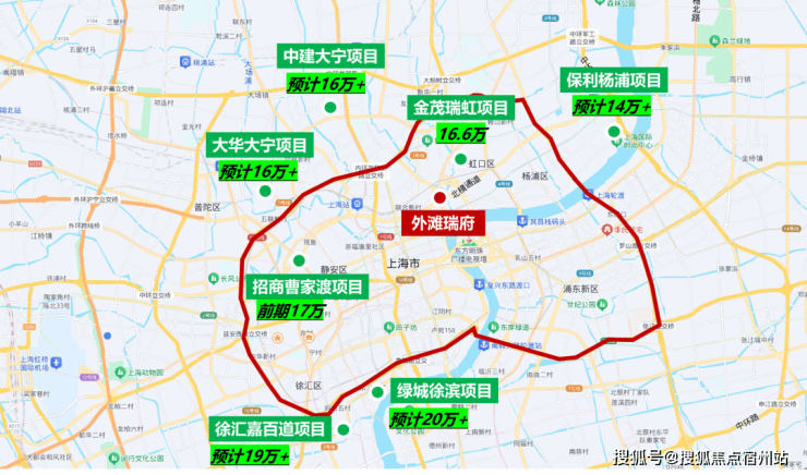 今年六批次土拍,绿城竞得北外滩新宅地,溢价率超过46%,未来售价预计突破20万元,它的位置就在「外滩瑞府」东侧约1KM。