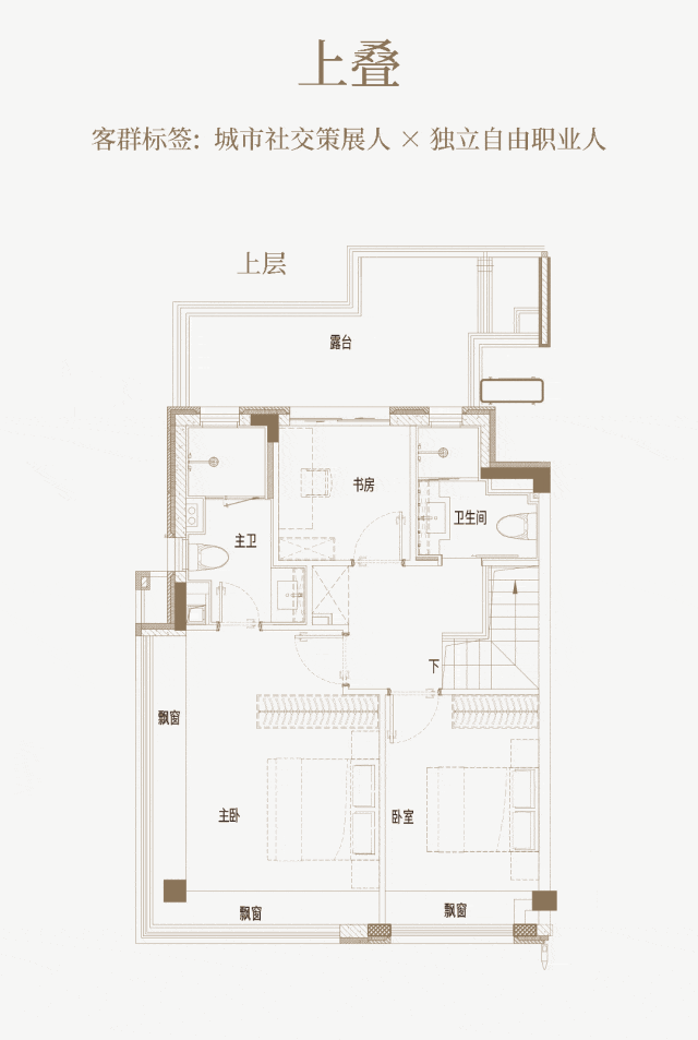 建面约139㎡上叠户型,三层是会客区,四层是居住区,阳台+露台+多个飘窗设计,附加空间非常大,在别墅类产品中实属罕见!