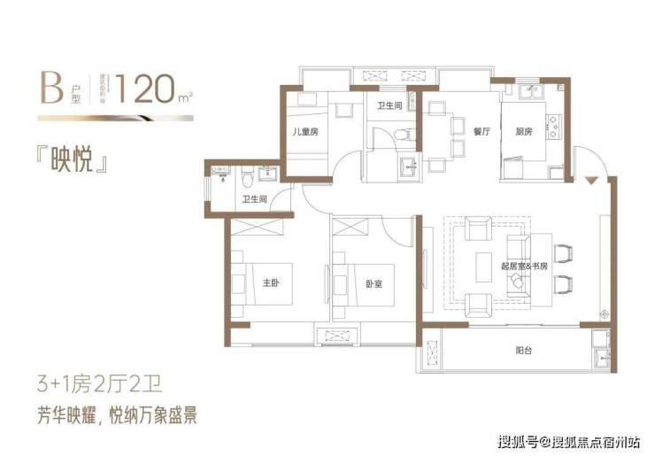 『映悦』约120㎡3+1房2厅2卫:3+1灵动空间为成长型家庭定制,容纳万象;奢阔横厅,阳光与美景,映见人生宽境;客厅与开放式书房相融,开启生活格调;IMAX巨幕观景阳台,邂逅流动的四季诗意;四面宽向阳·全明格局·全系飘窗,向美而居。