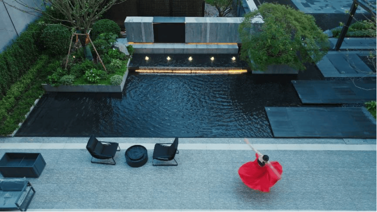 从空中俯瞰,跌水水景、亲水平台、色叶树阵等多重景观交融,展开一幅无与伦比的山水画卷。