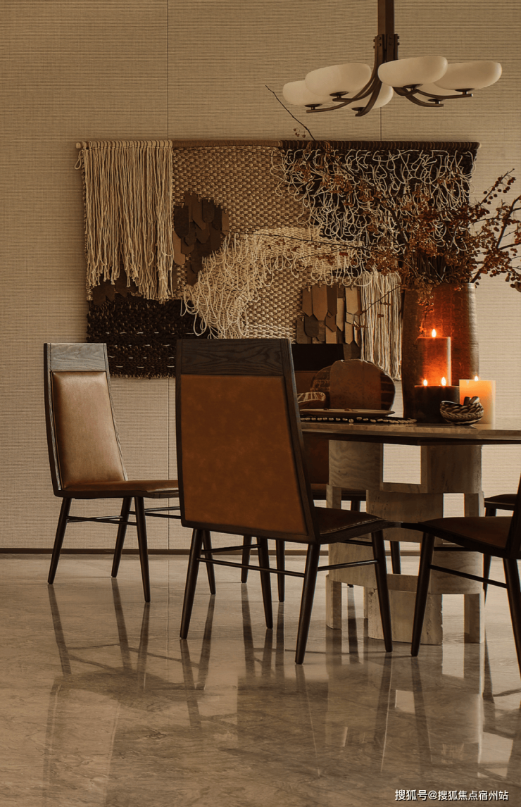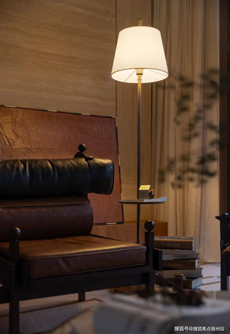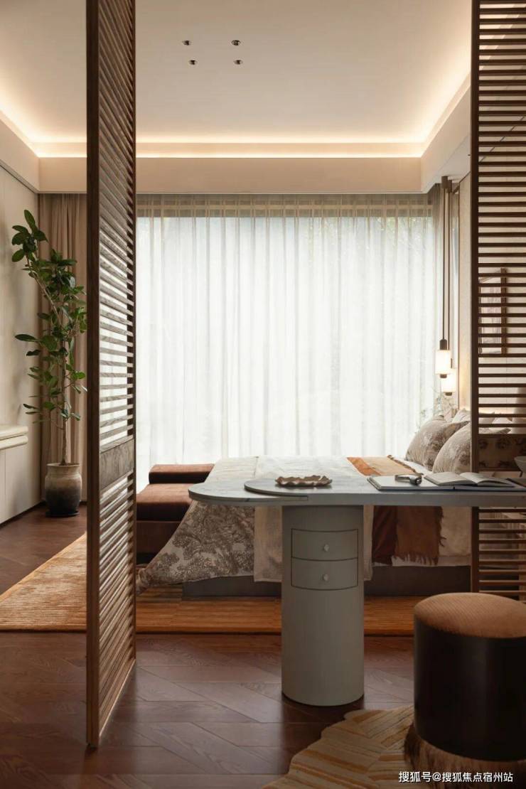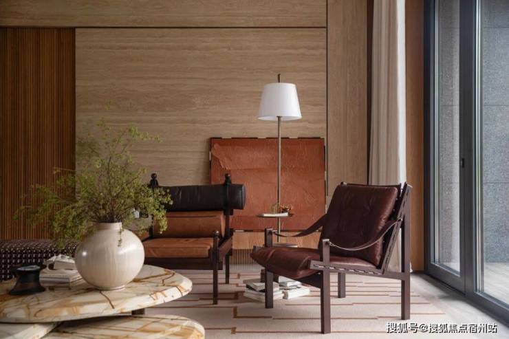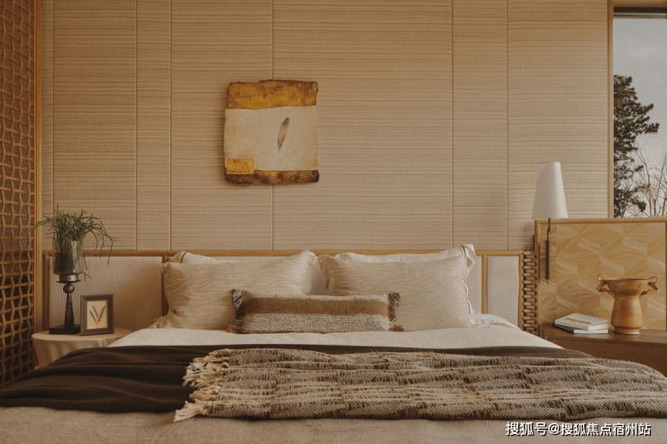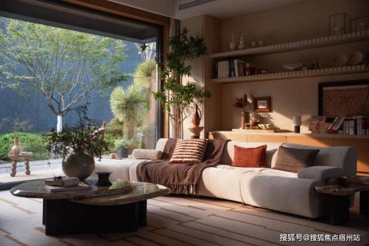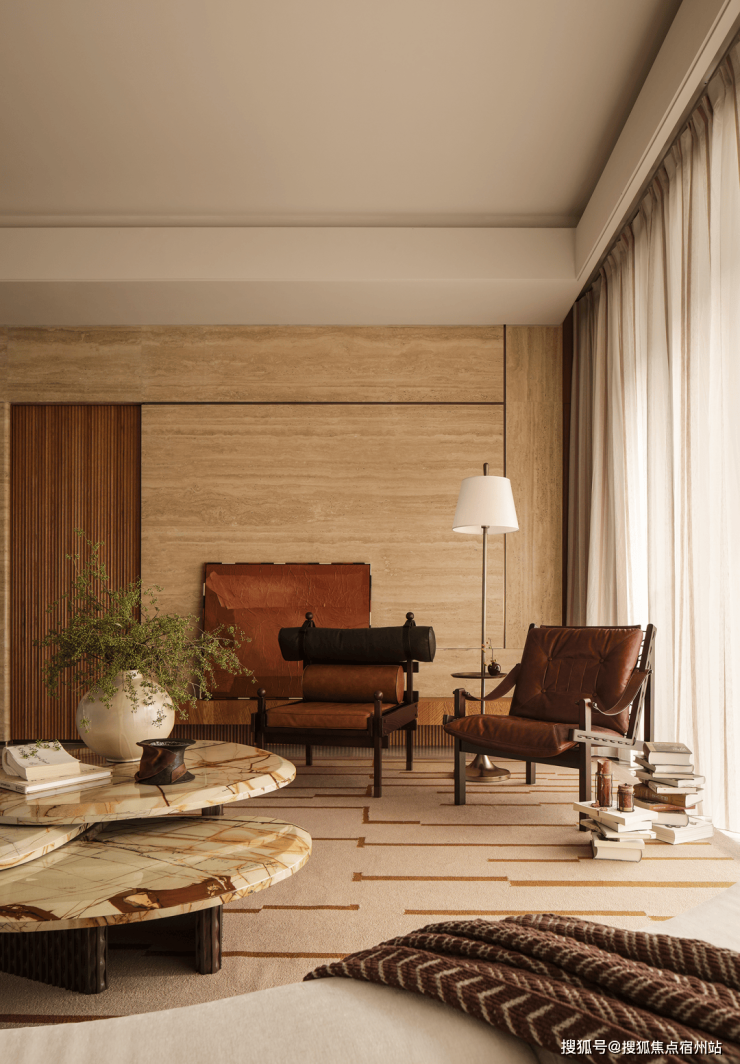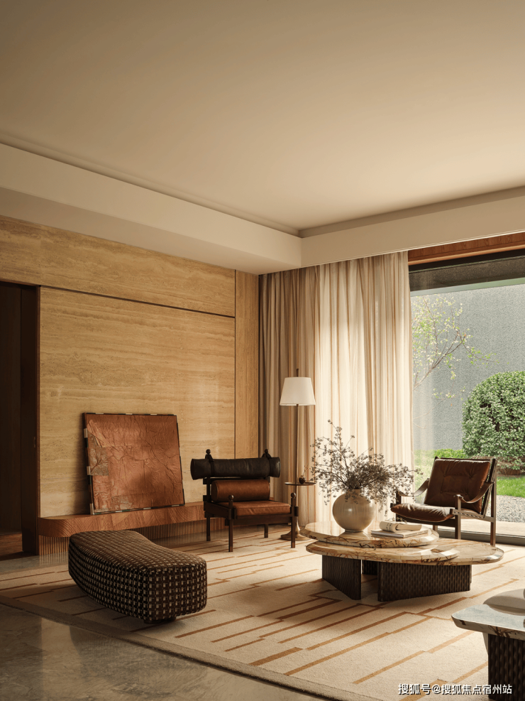 自然洞石的天然纹理与绿植形成"自然性"表达,呼应度假场景中"都市度假"诉求;阳光透过窗帘洒入柔和光影,与墙面共同营造疗愈性光环境。