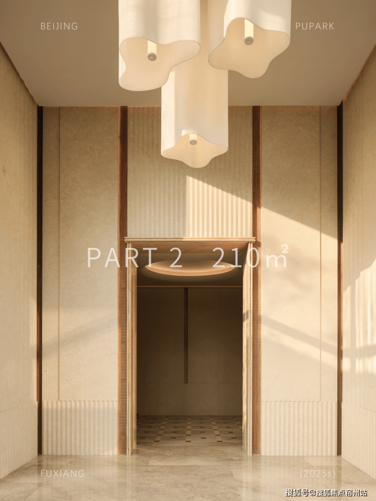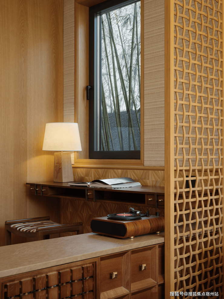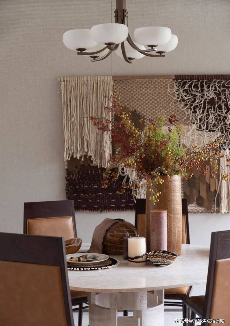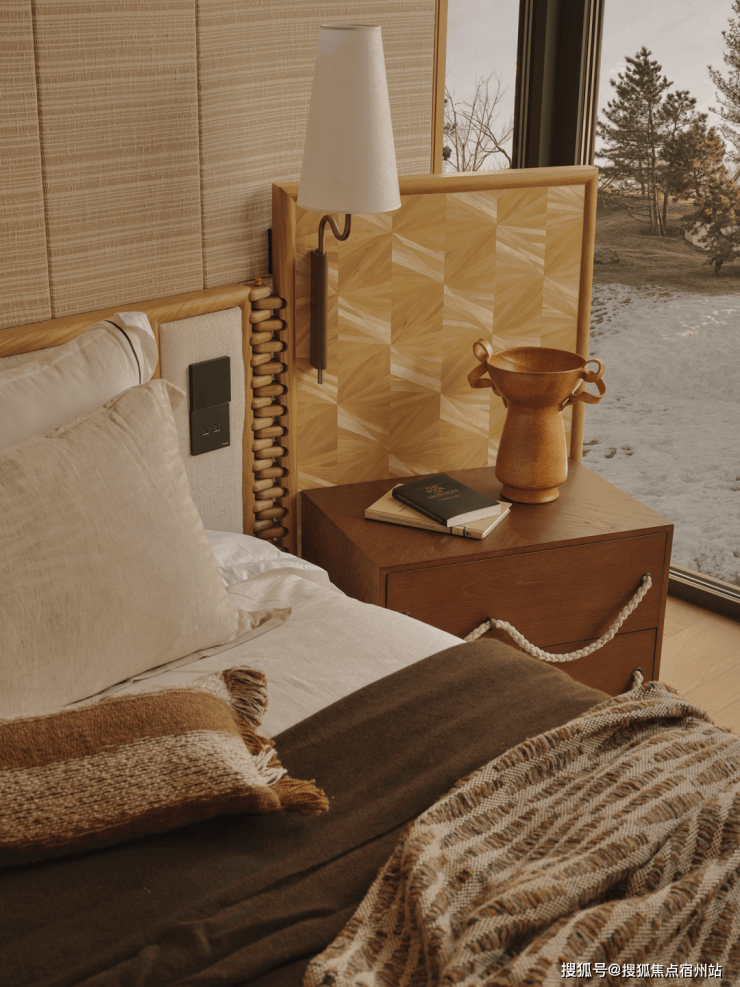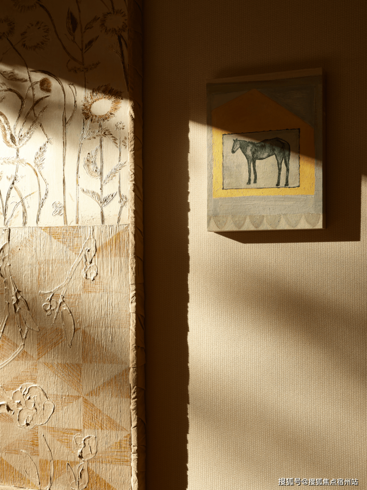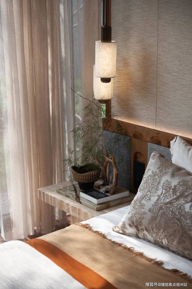 自然洞石的天然纹理与绿植形成"自然性"表达,呼应度假场景中"都市度假"诉求;阳光透过窗帘洒入柔和光影,与墙面共同营造疗愈性光环境。