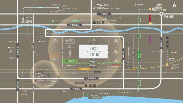 双轨加持——距离金山铁路亭林站约2.5km,5站到上海南站,轨交南枫线(规划)串联上海南部客流主动脉