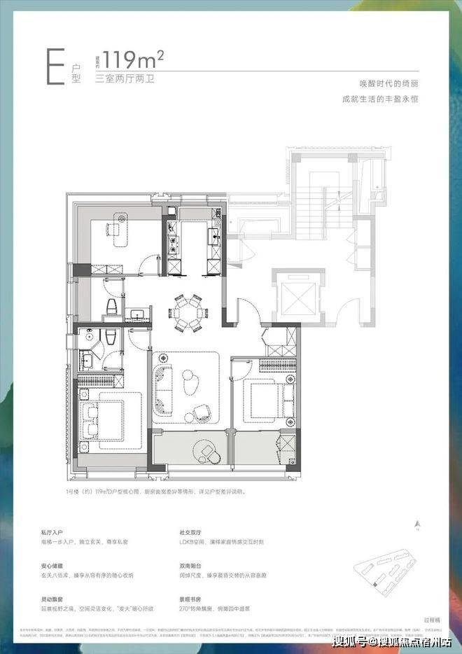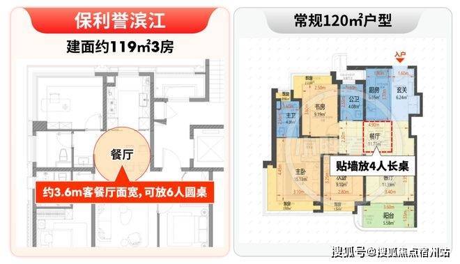 建面约119㎡户型,客餐厅面宽达约3.6米,区别于常规户型只能贴墙放4人长桌的局促,这里可从容摆放6人圆桌,逢年过节全家聚餐,再也不用“挤着吃饭”;