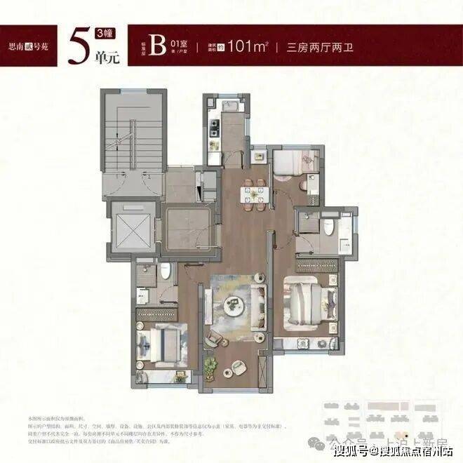 建面约100-101㎡户型,拥类独立电梯厅,无连廊+飞机户型南北通透。
