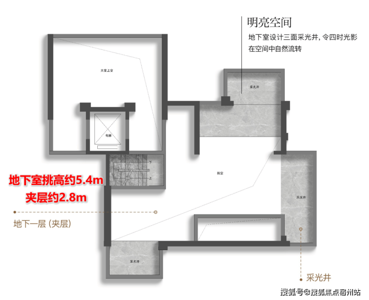 此户型的另一核心价值点,在于其约5.4米挑高的地下室空间。配合采光井的设计(地下室面积约125㎡),有效解决了传统地下室昏暗潮湿的痛点,将其变为一个可自由定义的功能场域。无论是打造为私人藏酒阁、专业级视听室,还是禅意茶室,皆能随心所愿。