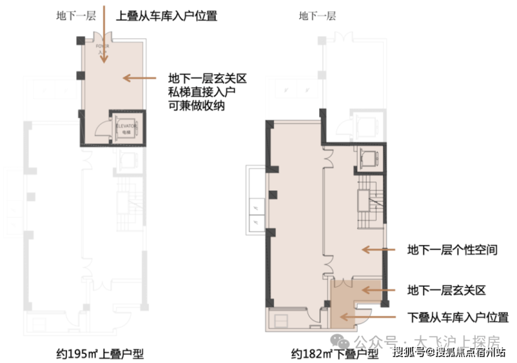 每套叠墅均有地库直接归家动线。无论是上叠还是下叠,都在地下一层有独立专属门厅,且面积不小。