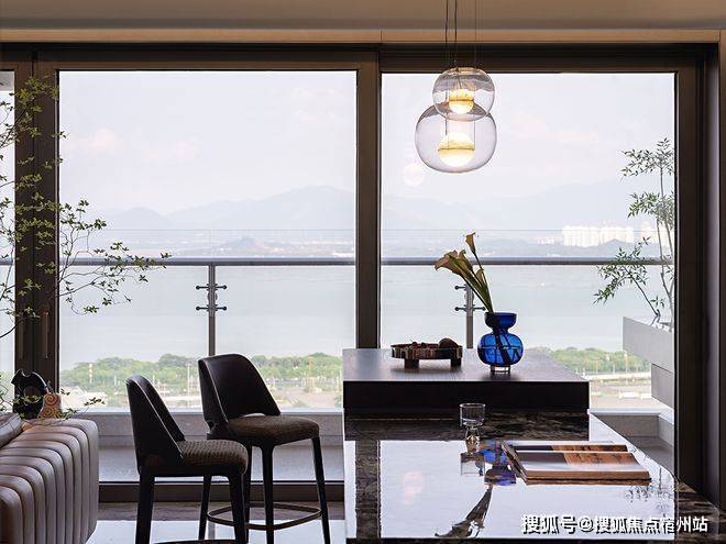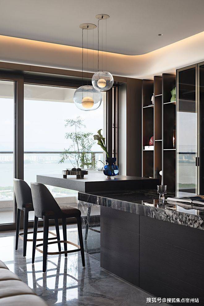 黑色岩板台面与整体色调形成戏剧性对比,赋予空间沉稳的质感。