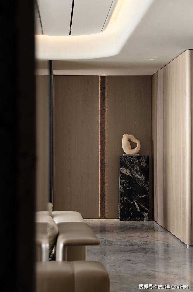 空间中的艺术细节值得玩味。墙面精心设计的线性凹槽,角落陈列的雕塑作品,这些看似随性的点缀实则经过严密推敲。它们以微妙的介入方式,为简约的空间注入了生动的韵律。