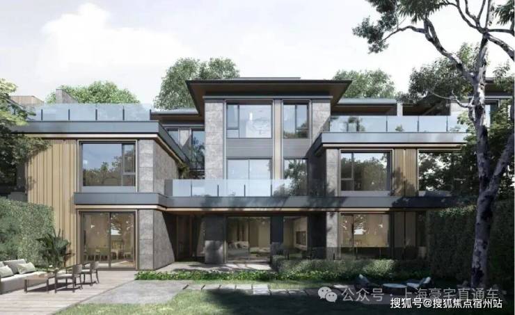 经典三段式别墅立面及大窗墙比,实现居住与自然的延伸;中灰色石材为基座,奢石宁静与土地矜贵互为映衬。
