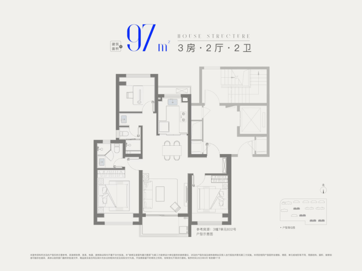 建面约97㎡3房2卫,升级版大3房, 入户玄关+主卧套房设计,整体私密性更强,空间更为宽敞。