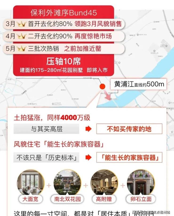杨浦滨江风貌带全新供应,约500米滨江+臻稀风貌+超级花园, 保利·外滩序BUND45在首开去化约80%,领跑3月全上海风貌销售榜后,保利·外滩序Bund45风貌于4月再度入市,去化约90%。