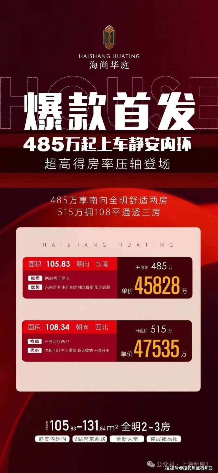 最新消息,静安内环内,新出优质项目【静安-海尚华庭】推售建面约105-108-120-131m²2-3房;均价4.65万/m²,总价480-630万;装标6000元/m²