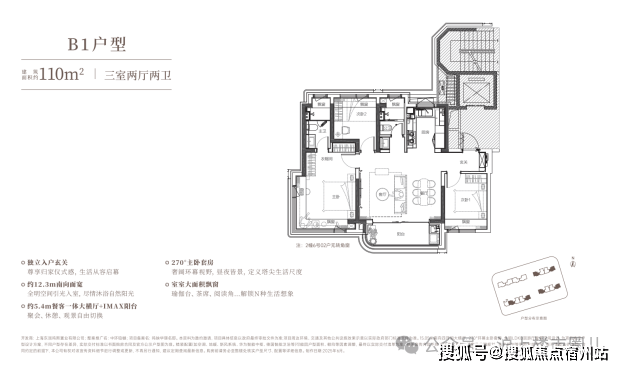 建面约110㎡三房边套户型,约5.4m超大横厅、南向面宽做到了惊人的约12.3米,堪比别墅级别的产品! 巨幕阳台+边套270°景观视野, 空间体验与采光感拉满!