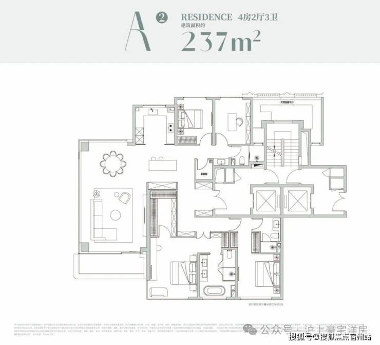 建面约 237 ㎡的四房两厅三卫大平层,整体以奢阔尺度和舒适体验为核心,客餐厅一体化横厅设计连通南向观景阳台,形成开阔通透的社交核心区,既满足家庭日常互动,也能从容应对商务宴请等多元场景;全屋采用多套房布局,主卧配备步入式衣帽间与独立卫浴,两间次卧也均为套房设计,充分保障每位家庭成员的居住隐私与舒适感,同时中西双厨的配置兼顾了中式烹饪的实用与西式轻食的社交属性,加上独立玄关的归家仪式感、多飘窗的空间拓展,以及保姆间与居住动线的完全分离,从细节处打造出兼具尺度感与人性化的高端居住体验。
