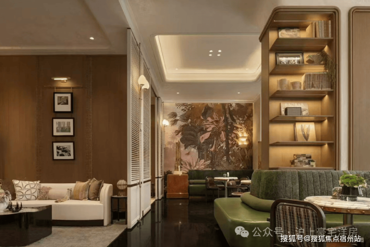 作为未来主入口的 水畔之汀 ,则以海派弧形收边延续建筑风格,幻影蓝流水墙、普拉达绿景墙与奢金影灯形成撞色视觉焦点,中央更移植了百年桩景红果冬青与进口红枫,一步一景间皆是仪式感。