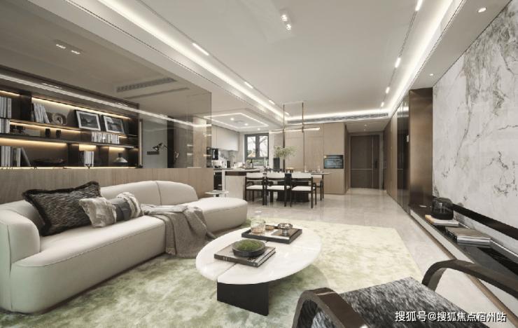 而在硬性标准之上,保利·海上瑧悦还充分融合了东方文化高定细节!比如说,客厅整面交付的大面积岩板背景墙均为东方定制款式,采用的是水墨丹青和徽州印象样式,配色风格凸显东方风雅;