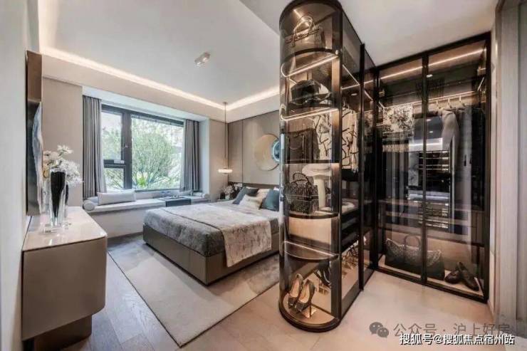 套房式主卧: 主卧的面宽和进深都很充裕,为每一个生活场景预留了足够的空间。双面转角的衣帽间区域,非常实用。