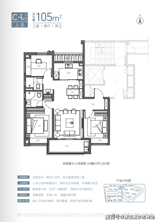 建面约105㎡3房2卫: 项目建面约105㎡3房2卫有两种风格(宽厅、竖厅),尤其是宽厅户型,设计格外惊艳。