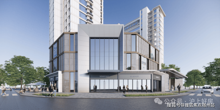 建筑风格遵循少即是多的设计理念,现代而又简约: 立面利用 大面积玻璃窗+仿石多彩漆 ,局部层间金属线条,并在首层基座采用人造石材和铝板等装饰材料,提升了建筑整体感和精致度。顶层 外挑飘板 使得建筑立面体块清晰,层次丰富。