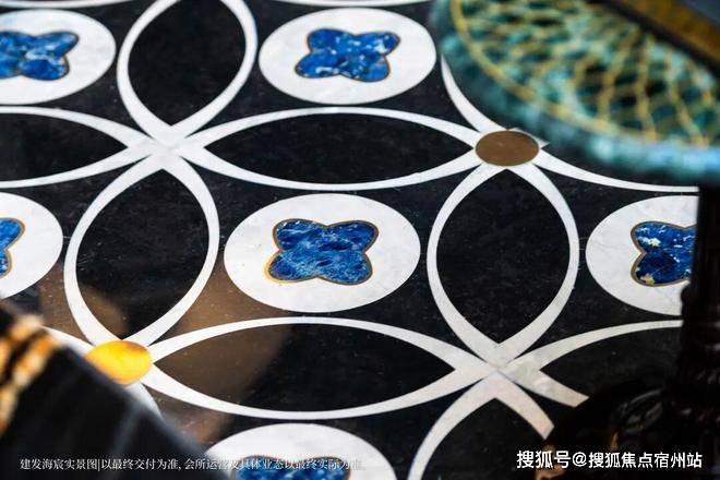 地面采用三种不同色调的天然石材水刀拼花而成,形成如水面波纹般的自然纹理。