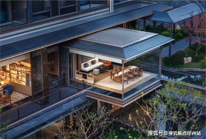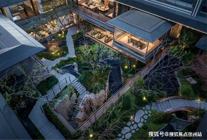 而最令人惊艳的,当属约6米地势差打造的下沉式山水庭院,山、石、水、林有序交织,犹如一幅“豁然开朗”山水轴卷,每一步皆是景致,每一处皆有不同。