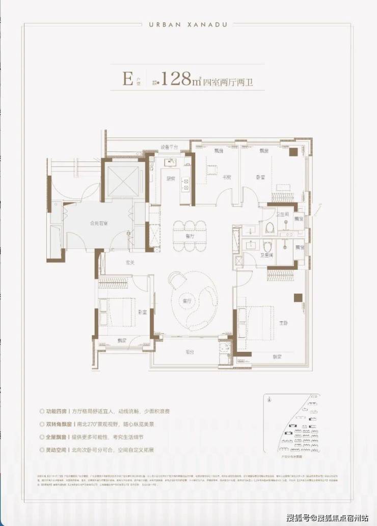 主力户型建面约128㎡4房2厅2卫,做到了 3开间朝南+主卧套房设计+270°转角飘窗+多个飘窗+卫生间干湿分离 ,空间更加阔绰!