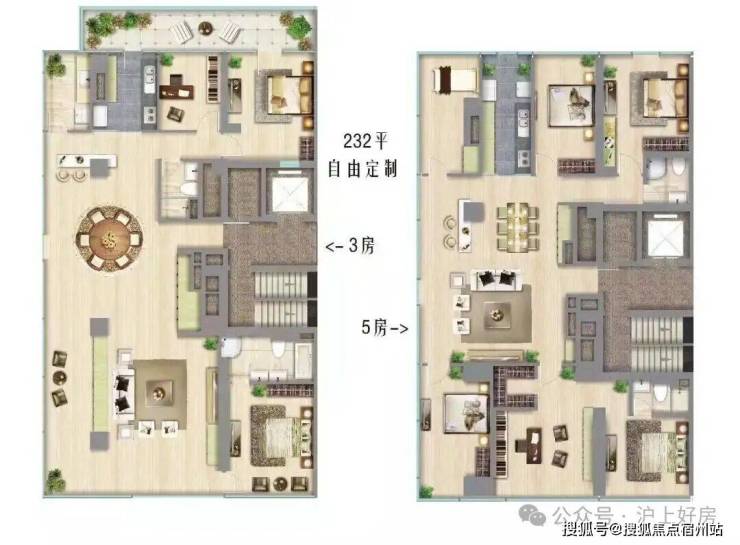 以232㎡面积产品为例,既可以做成3房也可以做成5房, 全看用户灵活定制要求。追求简约艺术风格的话,你要做成大平层2房甚至1房也可以,留下空间来室内滑板或开卡丁车!