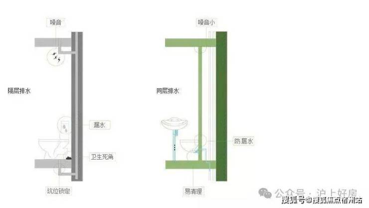 这样的设计大大节约了室内空间、美化了视觉效果,同时消除卫生死角,防止异味。各种管道不穿越楼板,上下住户无干扰,做到静音排水,告别噪声。
