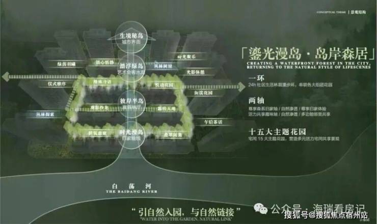 重点来看小区内部景观,项目以“山水聚场”理念,规划 “一环两轴十五园” 景观布局,将水岸、岛屿、森林、花园、树屋作为园林节点,形成“行在景中、坐在岛中、游在林中、意在境中”的美学表达。