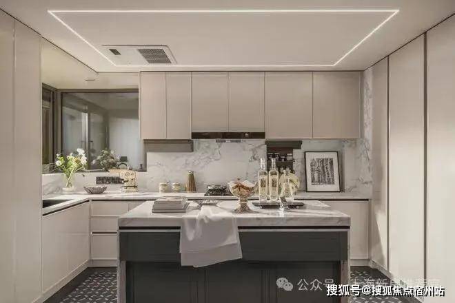 厨房更是拥有别墅级大空间,通铺中央空调、地段,甚至还有交付的奢石大岛台。