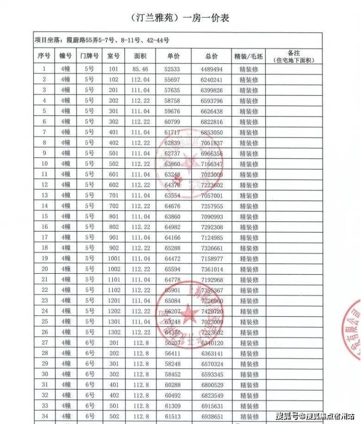 上期一房一价表如下: