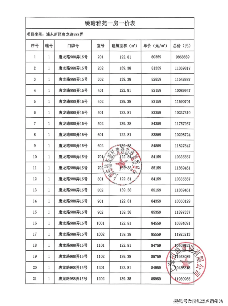 一房一价表: