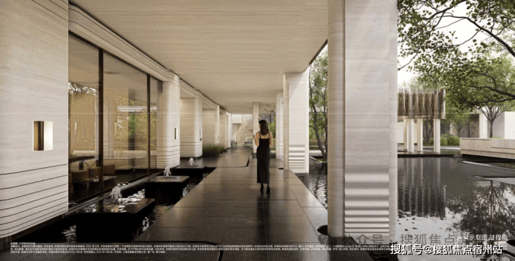 约5米宽的流光回廊,打造无风雨归家体系,以香槟铝板为顶、辅以黄金比例柱列,涌泉水钵,展现了【水】的不同表现形式。