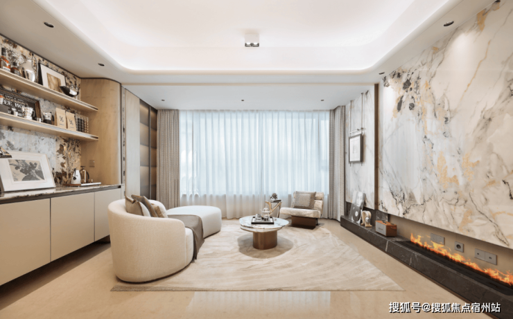 其客厅地面整体采用了奥特曼米黄奢石作为核心装饰,与整体无主灯设计相得益彰,营造出精致且富有层次感的时尚空间。