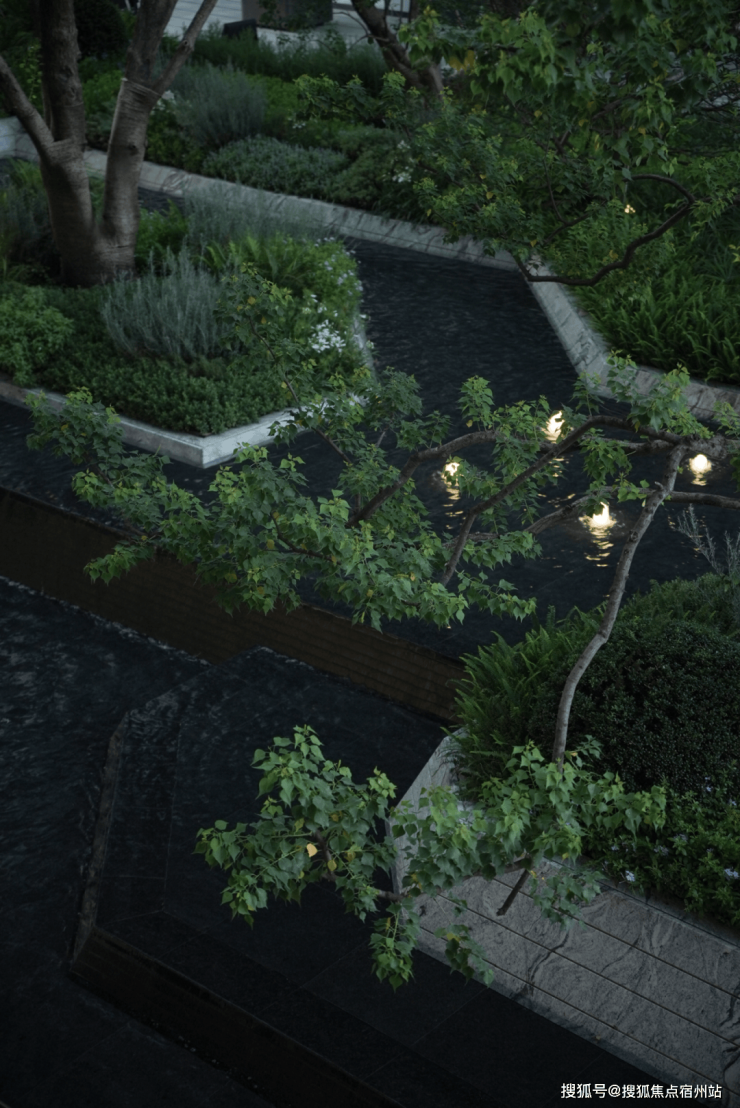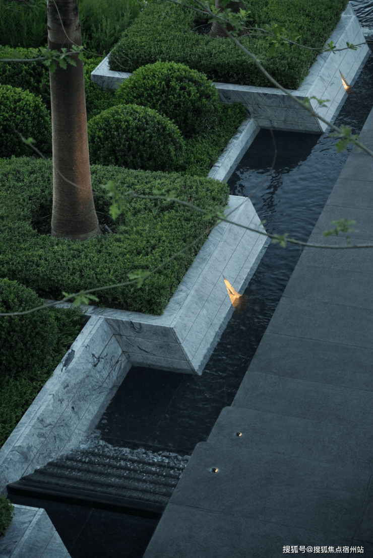 花池与水台的交界近景,借由地形高差,让水景与绿植形成丰富层次,以现代手法将自然意趣浓缩于一方天地,两种质感、深浅的体块嵌合之美,涌泉隐没在体块间,在日常风景里增加一点诗意的氛围。