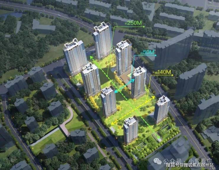 整体规划中,纵向中央绿轴超200米,横向景观轴约140米,南北楼间距约50-57米,东西间距也多超过44米。这不仅意味着更好的采光、通风与静谧性,更意味着每一扇窗外,迎接的不是邻家的墙壁,而是开阔的园景或远方的天空。