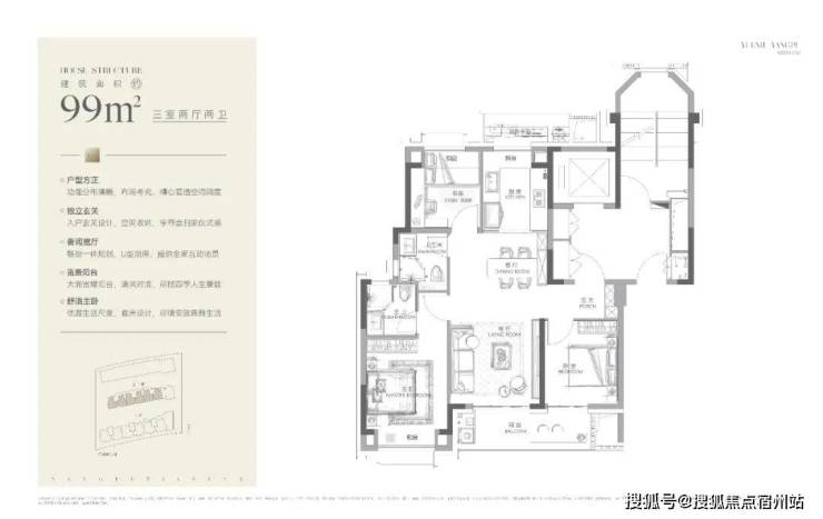 建面约99㎡经典飞机户型设计,南北通透,作息空间互不干扰; 集约化过道+多飘窗设计,视觉向外延展性更大,整体户型开阔感更强; 独立玄关+双卫配置,保证了业主足够的私密性和舒适度; 南向次卧与阳台相连,使得室内尺度、采光及通透性都十分出彩。