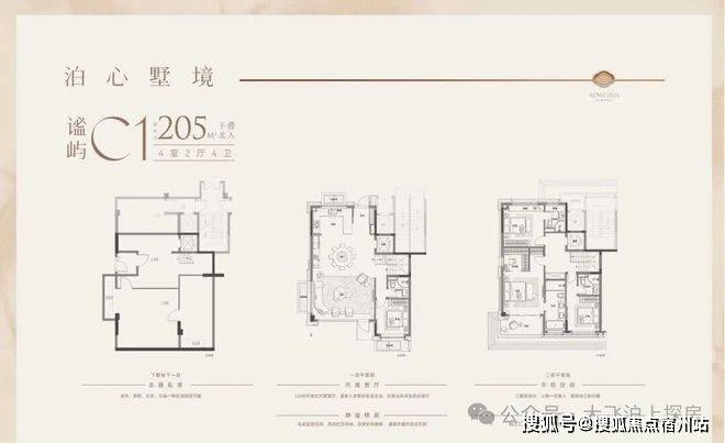 户型特点:下叠边套,南向面宽约9米,客餐厅同宽约5.8米,空间开阔。一楼设南向卧室,采光好且视野佳。二楼为三套房+主卧总统套房设计,主卫南向,可容纳浴缸和双台盆。地下室方正,附赠采光井,利用率高。