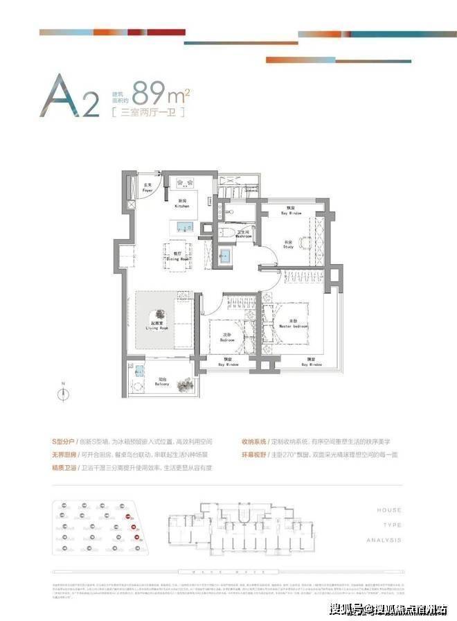 建面约89㎡3房户型:东边套主卧配置约270°双向采光飘窗、S墙设计,主力总价仅约450万级,首付约90万起!