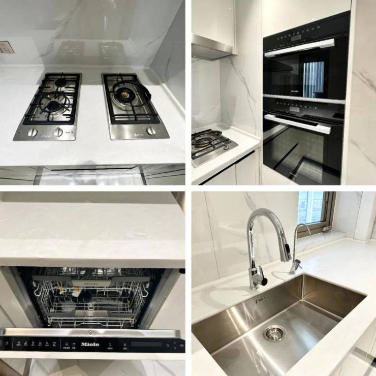 厨房电器采用美诺的5件套(抽油烟机,燃气灶,洗碗机,蒸箱和烤箱),橱柜品牌是博洛尼,弗兰卡水槽搭配抽拉式水龙头相当人性化!